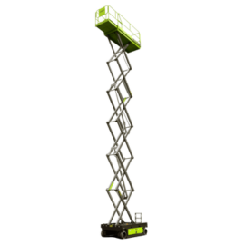 Elektryczny podnośnik nożycowy, wyposażony w wodoodporny napęd oraz nowoczesne baterie litowo-jonowe zapewniające długą i cichą pracę bez wymogu częstego ładowania.